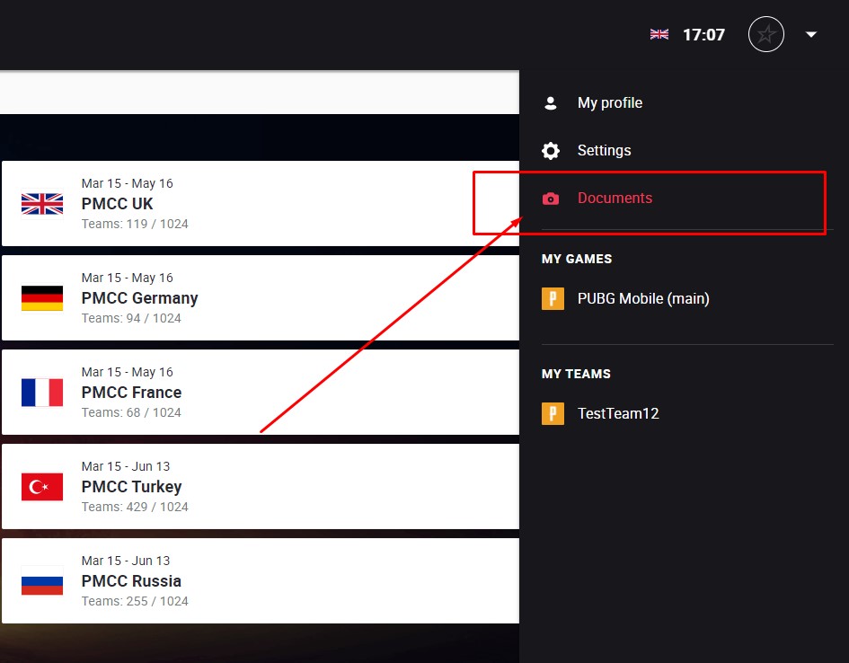 7. Status of your team can be checked on the tournament page. If some of your teammates doesn't have Yellow check mark, ask them to upload the documents same way you did.